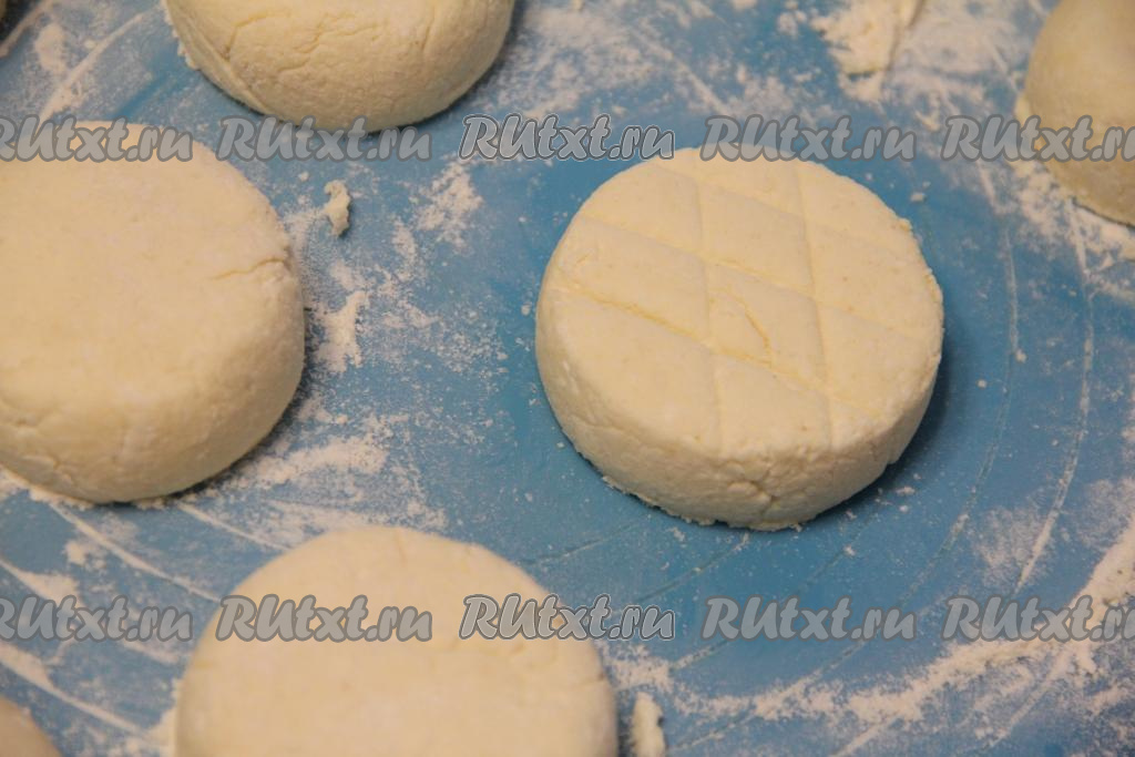 По истечении 30 минут достать творожную массу из холодильника, разделить на 8 равных частей. Сформировать 8 круглых сырников (для того чтобы сырники получились более аппетитными, я на их поверхности сделала насечки).
