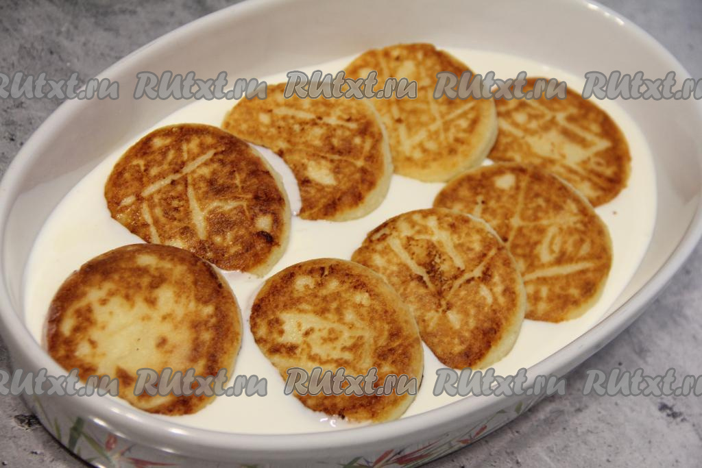В жаропрочную форму влить сметанный соус, выложить в форму сырники.
