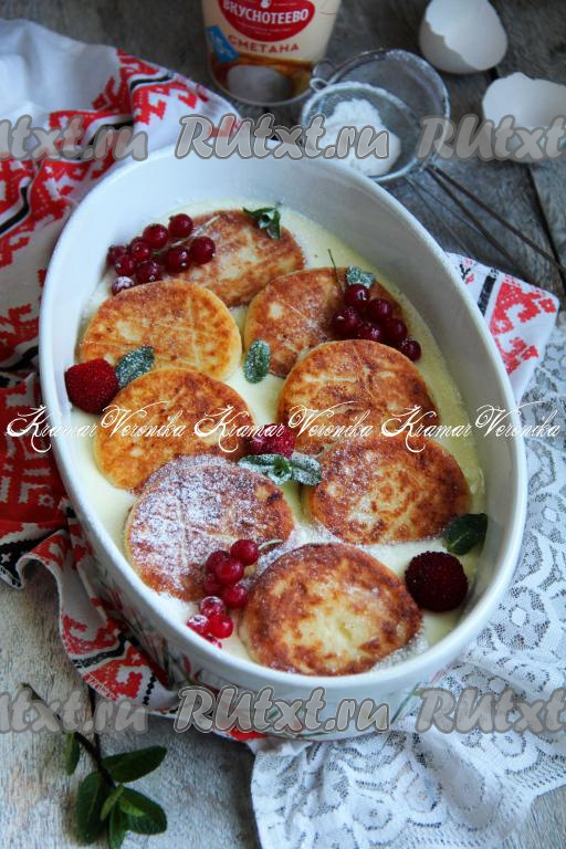 Вкусные, нежные, мягкие сырники достать из духовки и подать к столу в тёплом виде вместе со сметанным соусом, в котором они запекались. Я при подаче посыпала сырники сахарной пудрой и украсила ягодами.