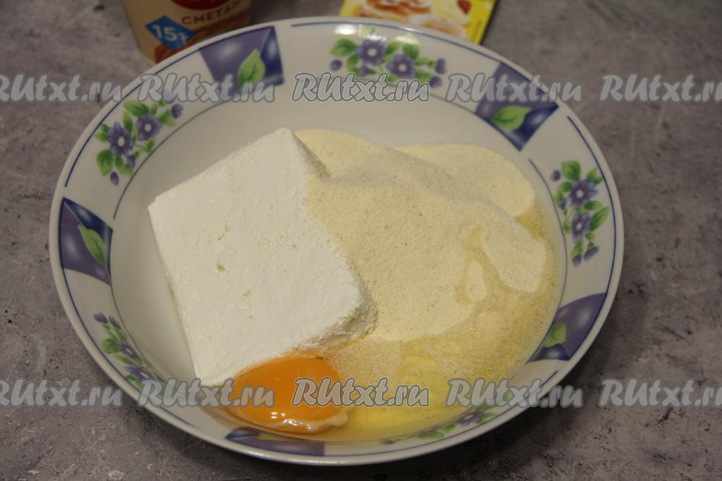 Прежде всего займёмся тестом для сырников, для этого в миске нужно соединить творог, яйцо, сахар, ванильный сахар и манную крупу, перемешать массу вилкой до однородности. Поставить творожную массу в холодильник минут на 30, чтобы манка набухла.