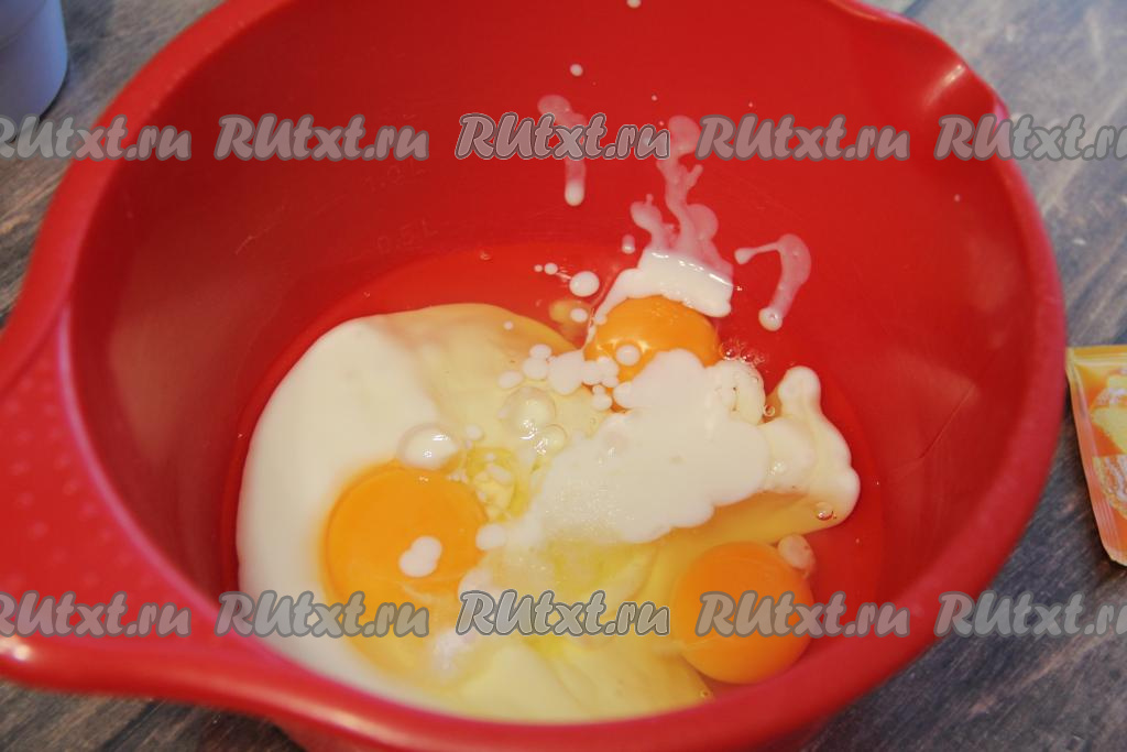 Для того чтобы замесить тесто, нужно в объёмной миске соединить кефир и яйца, перемешать венчиком до однородности.
