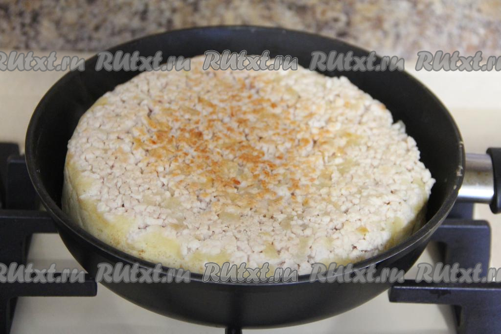Перевернуть пирог на другую сторону (удобно переворачивать вначале на плоскую тарелку, а затем перевёрнутый пирог вернуть уже на сковороду).