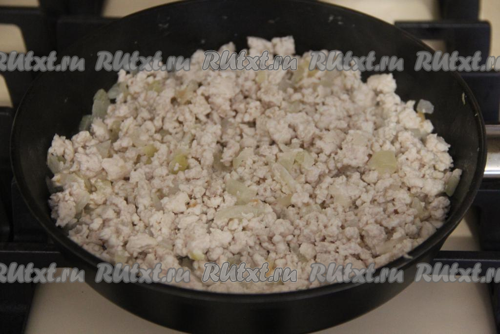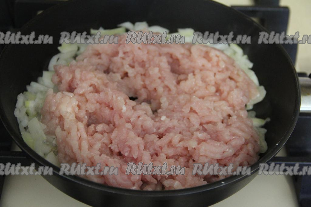Лук почистить, мелко нарезать, выложить в сковороду (я готовила на сковороде диаметром 25 сантиметров) с растительным маслом, обжарить его до прозрачности (в течение 3-4 минут) на среднем огне, иногда помешивая. К обжаренному луку выложить фарш. Жарить фарш с луком минут 15, разбивая комочки мяса.