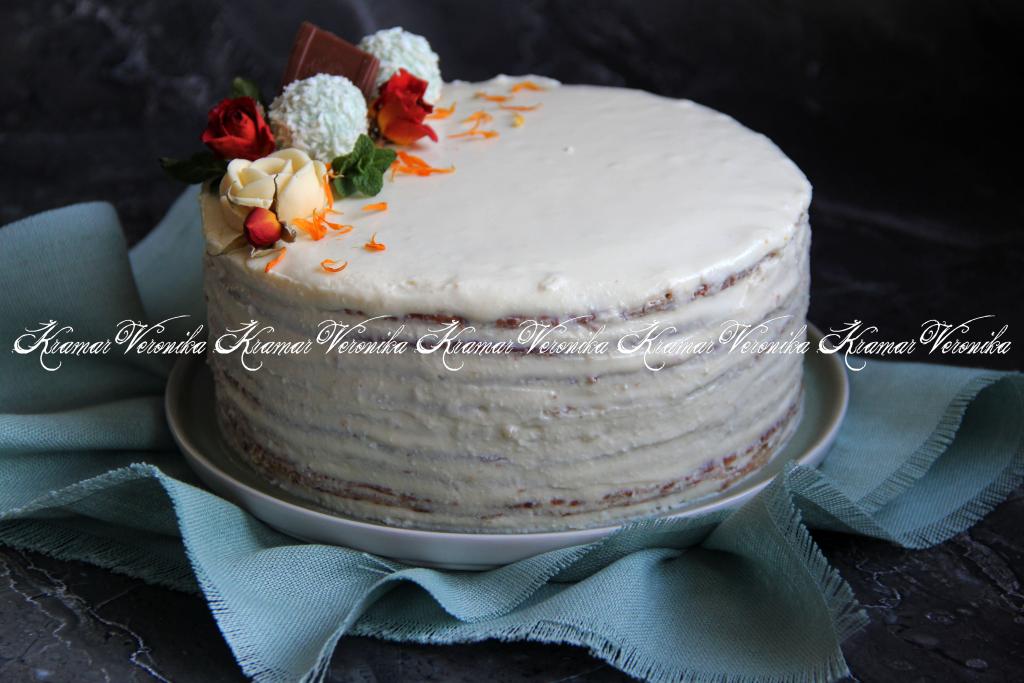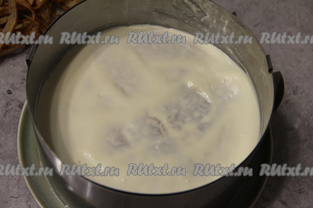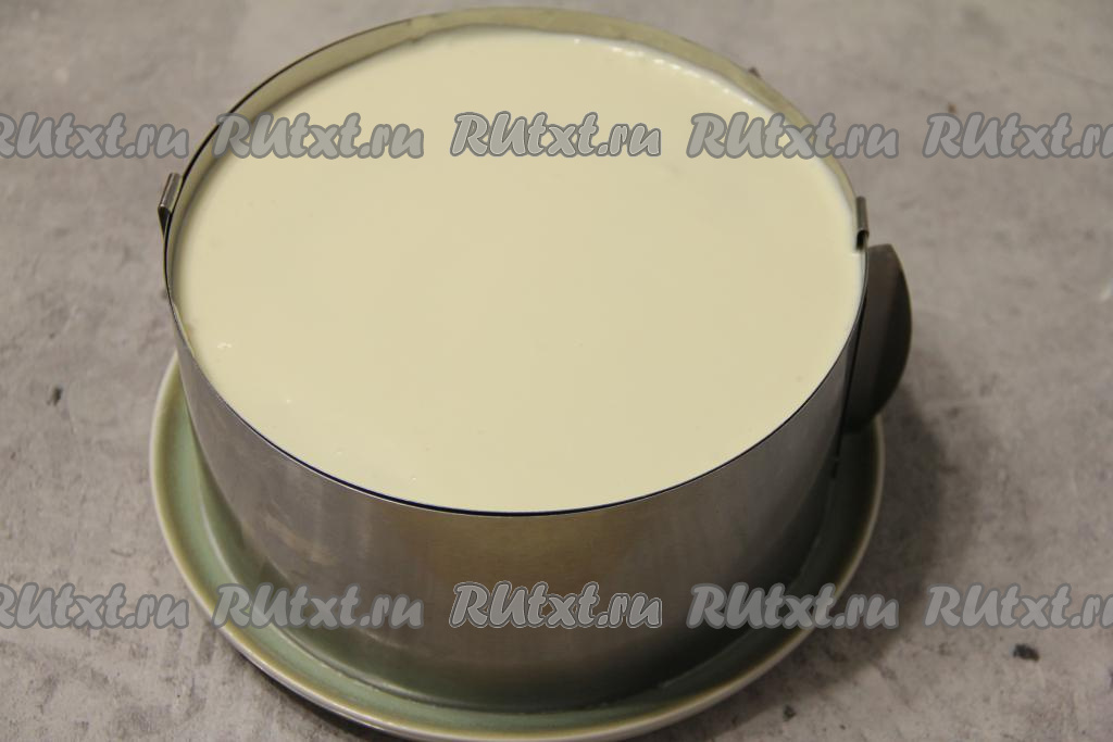 Собрать торт: я собирала в кулинарном кольце, смазывая банановые блины кремом и выкладывая их один на другой. В процессе формирования торта я срезала тонкие краешки блинов, но это необязательно.
