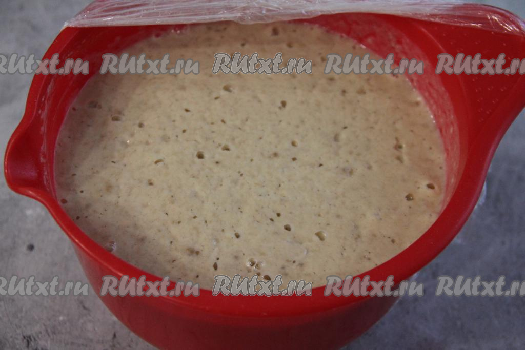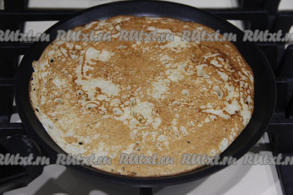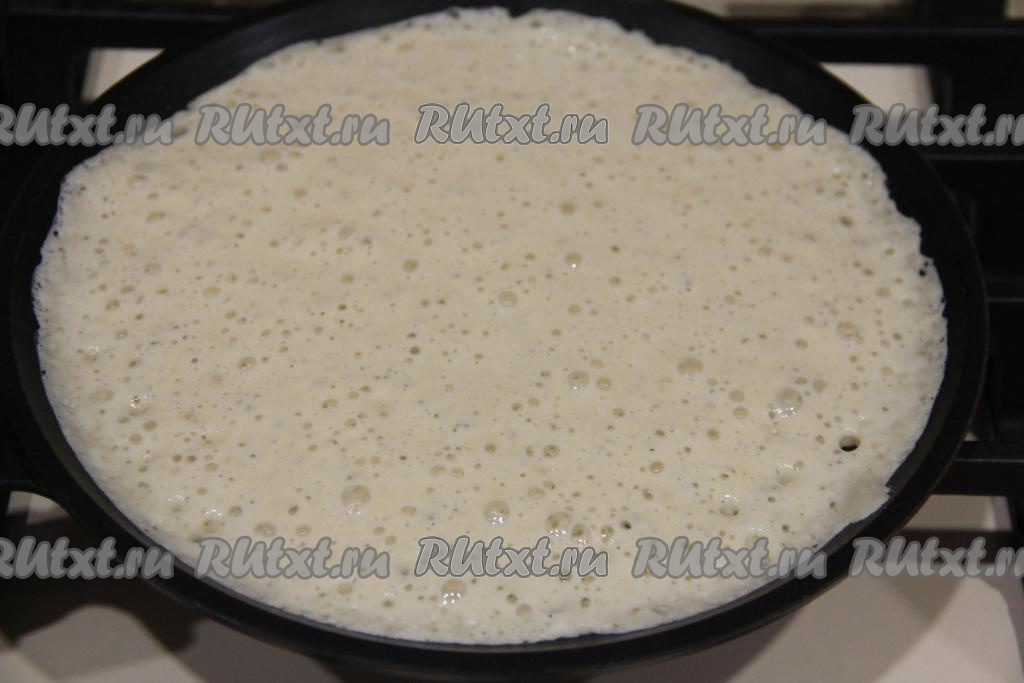 Накрыть миску с блинным тестом пищевой плёнкой и убрать в тёплое место на 1 час. Тесто запузырится и хорошо увеличится в объёме. После того как тесто поднимется, перемешивать его не нужно.