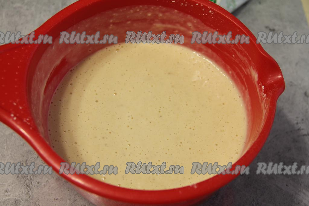 Перемешать тесто венчиком до однородного состояния. Блинное дрожжевое тесто получится не густым, оно будет чуть гуще, чем на блины.