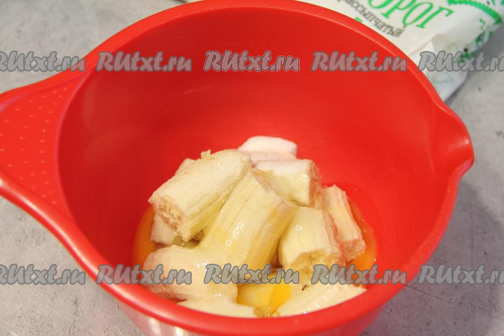 Прежде всего замесим тесто для блинов, для этого в объёмную миску нужно выложить очищенные бананы, поломанные на кусочки, добавить яйца и сахар, пробить массу до однородности погружным блендером.