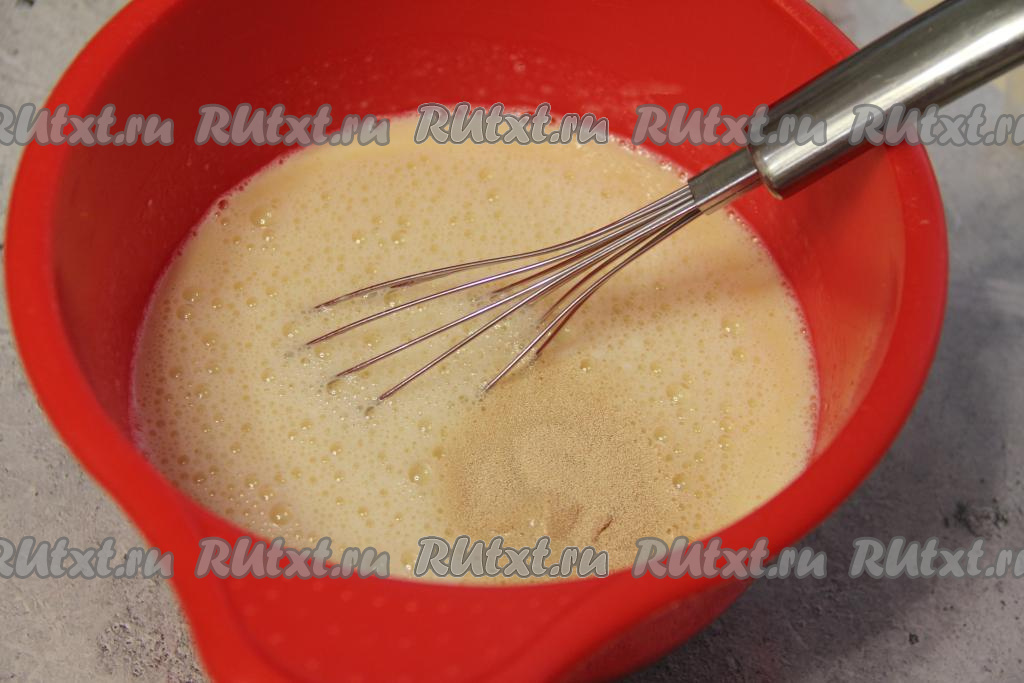 В получившуюся тёплую смесь всыпать дрожжи и перемешать.