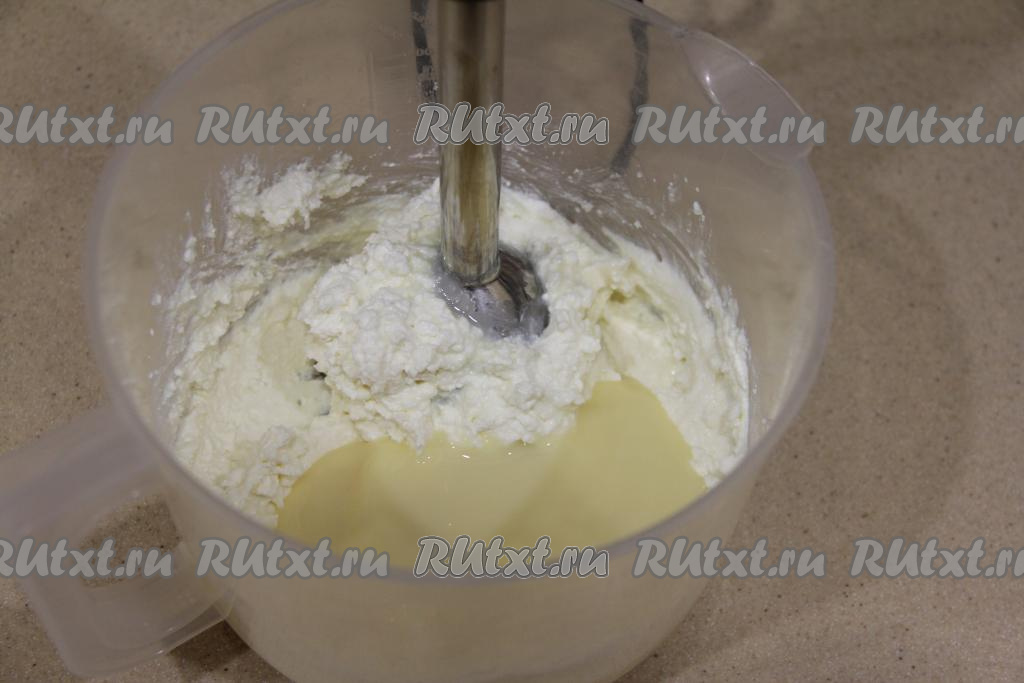 К смеси масла и творога добавить сгущёнку, пробить крем погружным блендером до однородности.