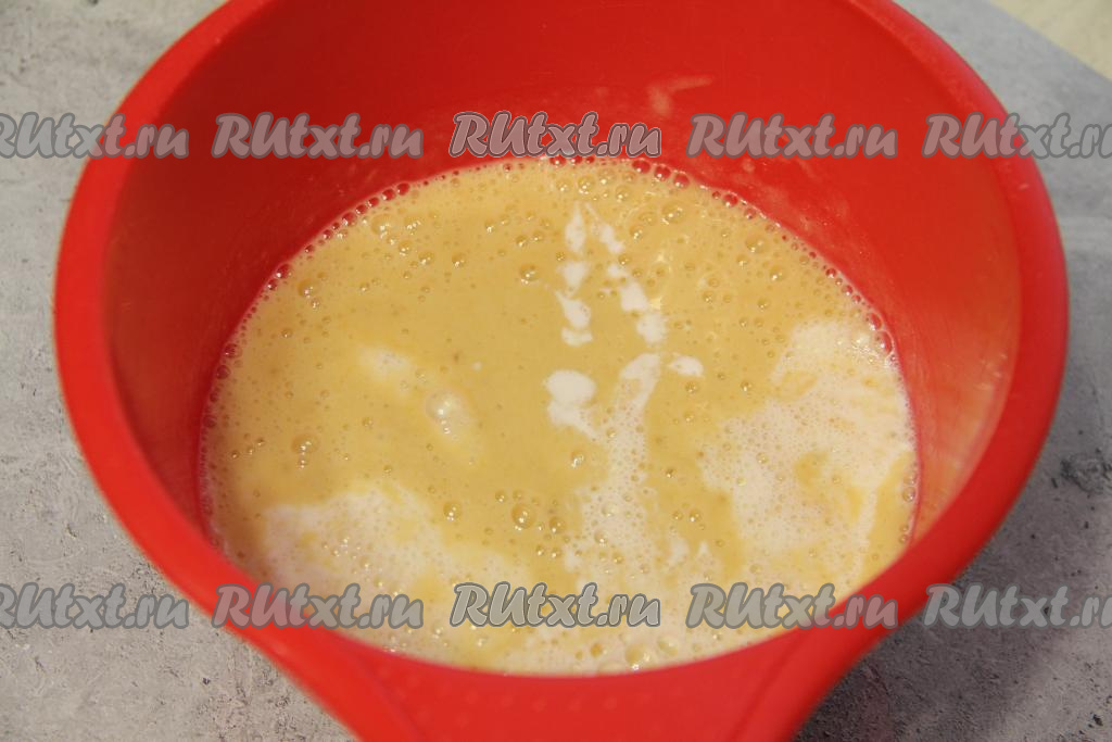В получившуюся массу добавить тёплое молоко и тёплую воду (температура и воды, и молока, должна быть не выше 50 градусов), перемешать венчиком.