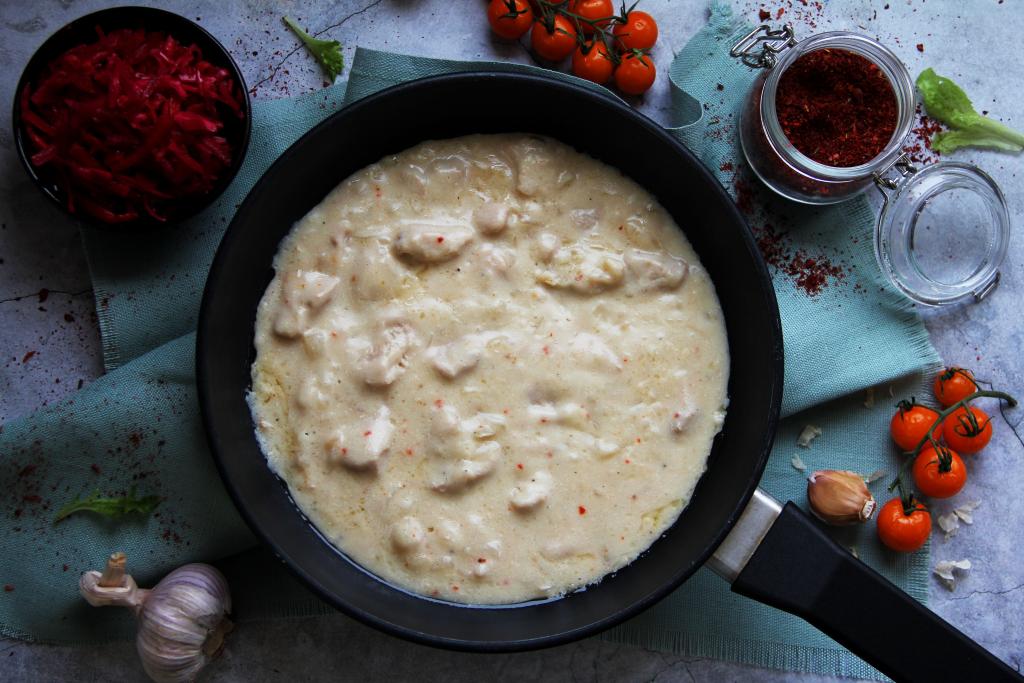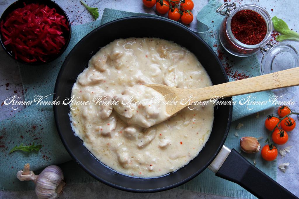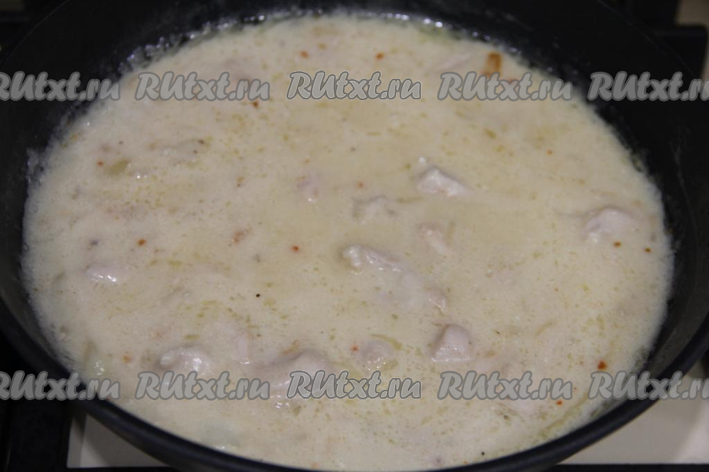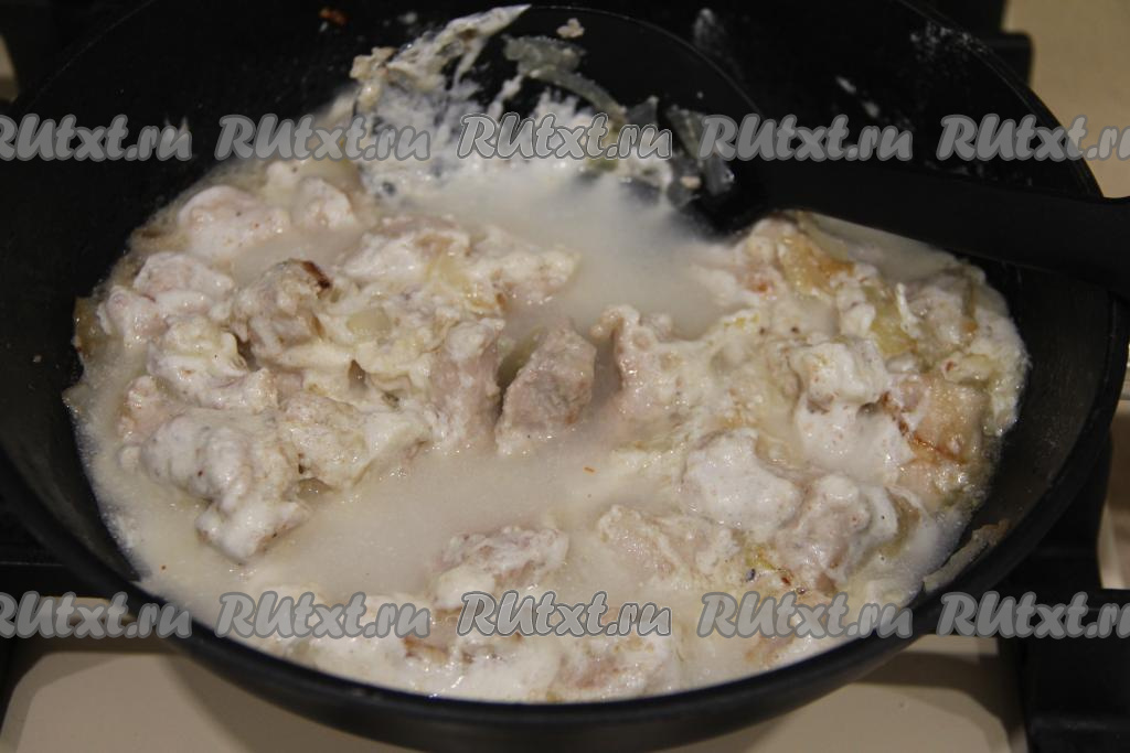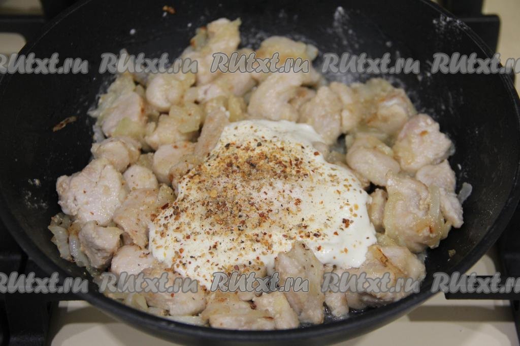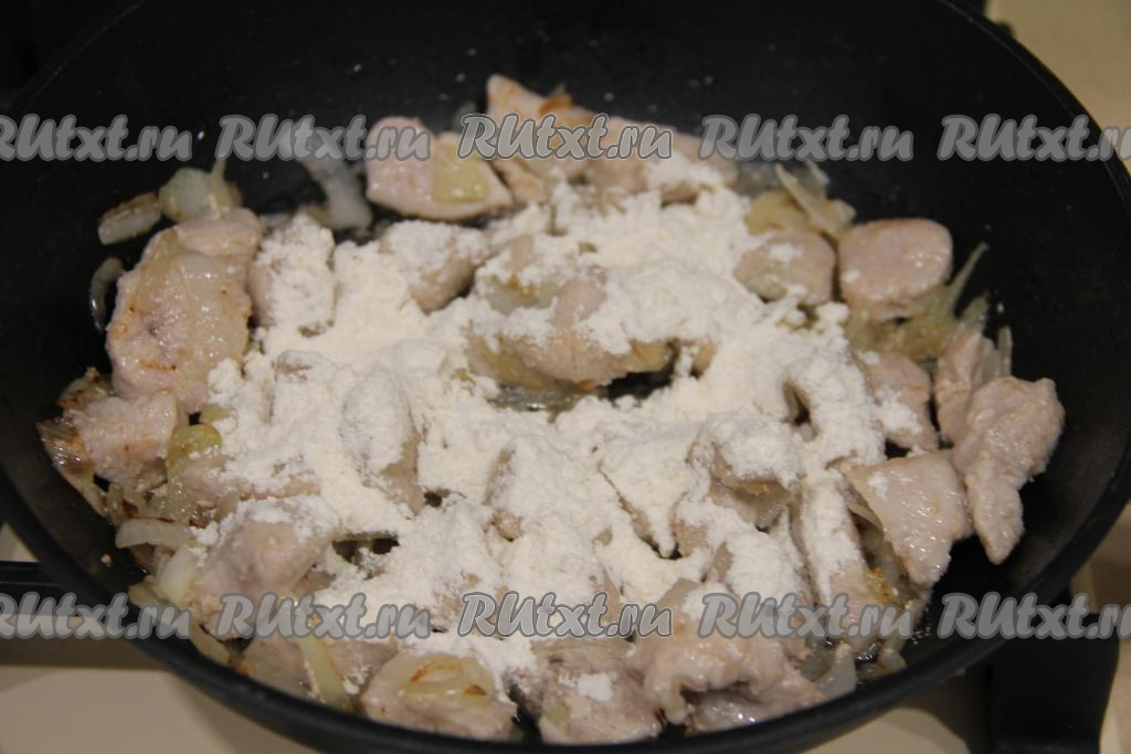 Тщательно перемешать кусочки индейки с мукой. Добавить в сковороду сметану.