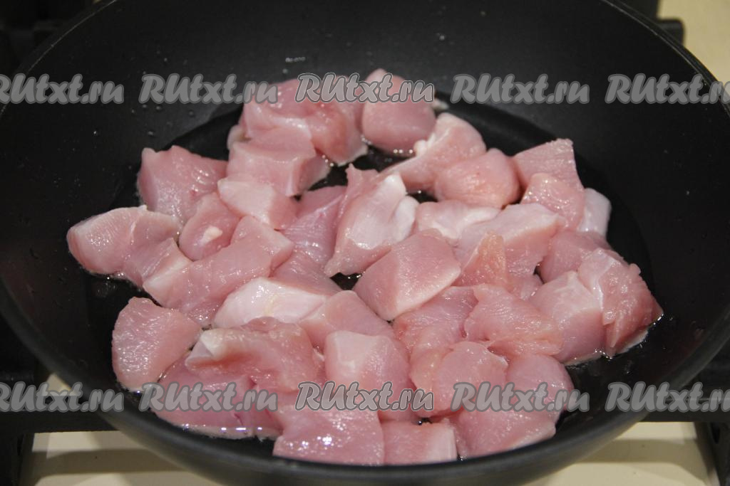 В сковороду с высокими бортиками влить растительное масло, разогреть его. Переложить кусочки индейки в сковороду.
