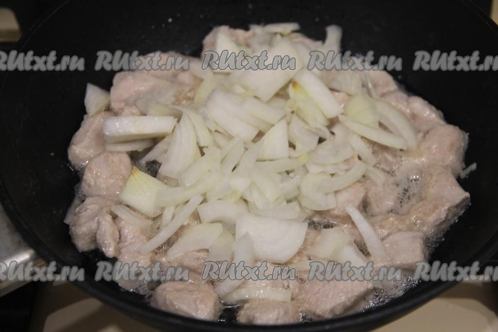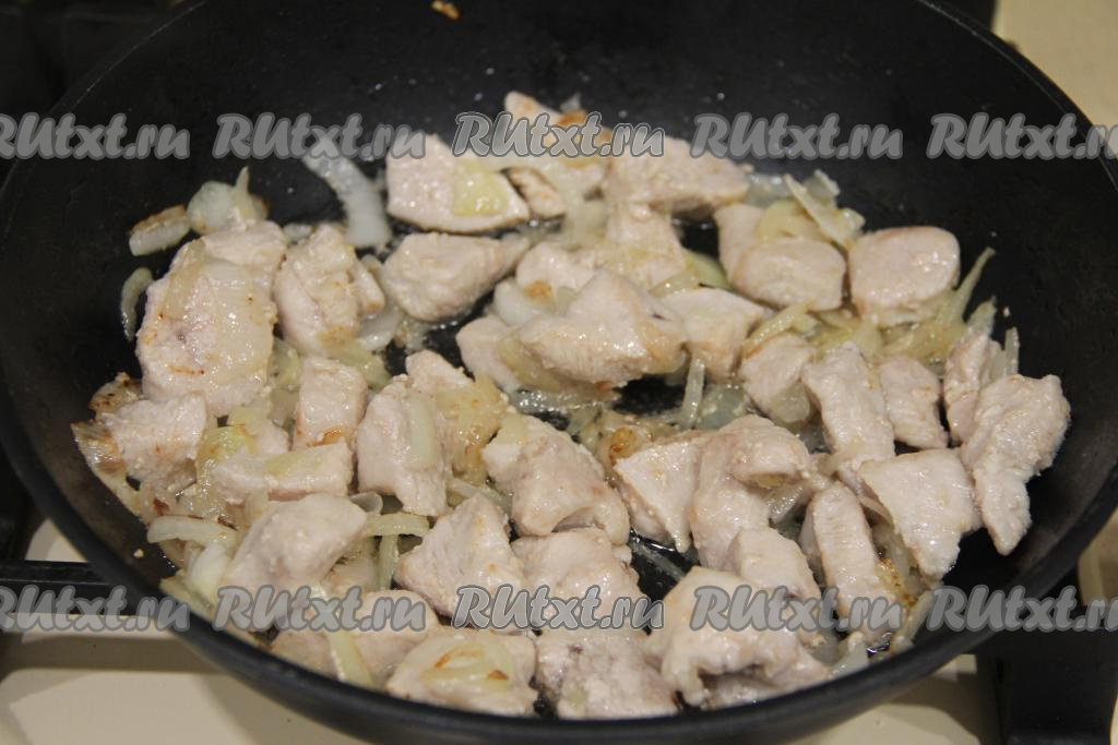 Обжаривать индейку на среднем огне минут 15, периодически перемешивая кусочки мяса, затем добавить лук, перемешать.