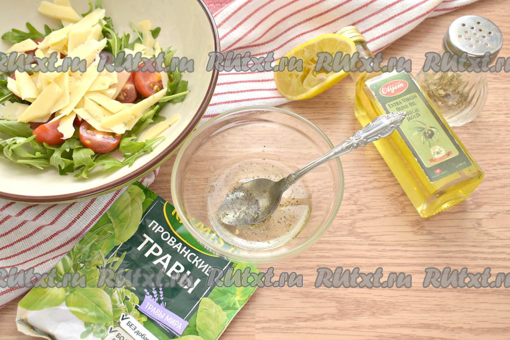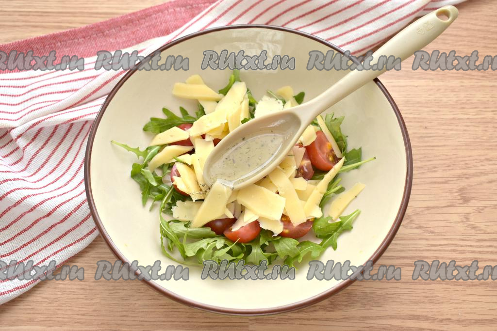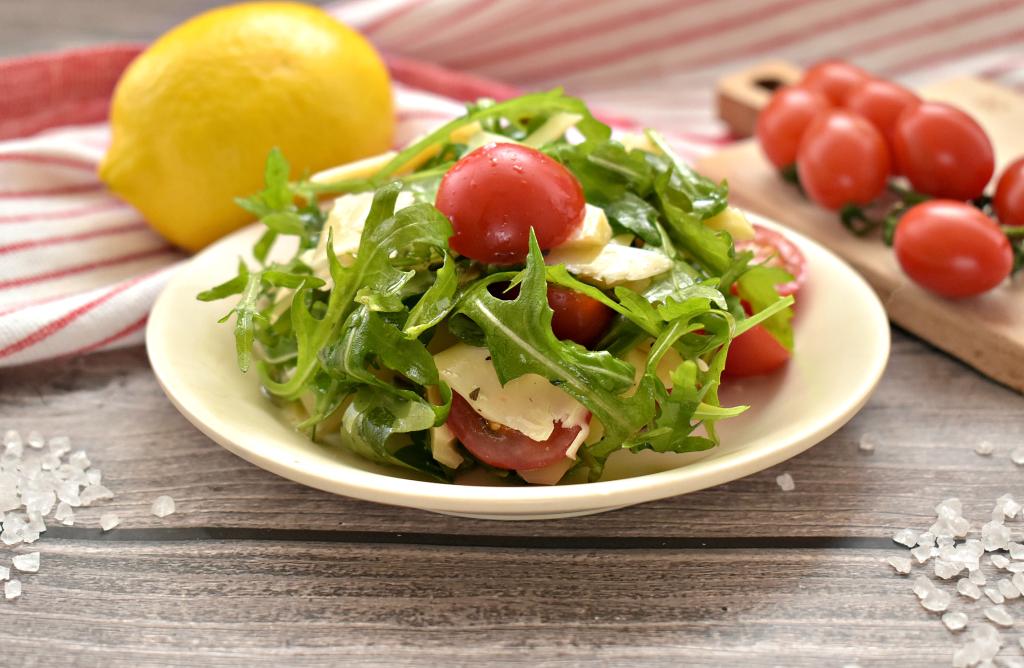 Вкусный, аппетитный салат, приготовленный с рукколой, пармезаном и черри, сразу подаём к столу. Такой салат прекрасно дополнит блюда из мяса.