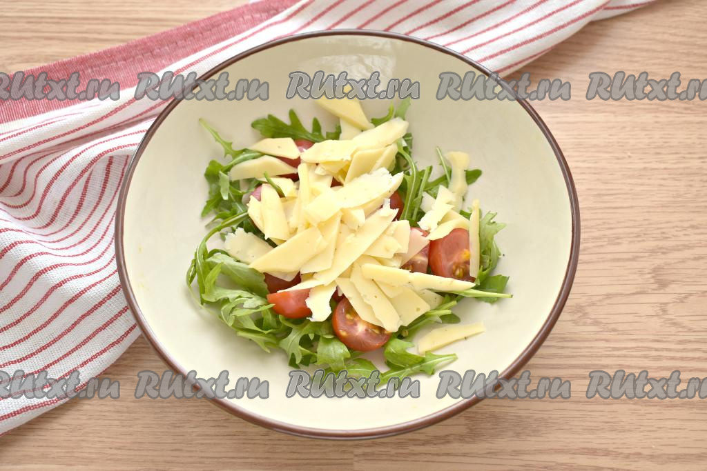 Пармезан нарезаем на тонкие пластинки и перекладываем в салат из рукколы и черри.