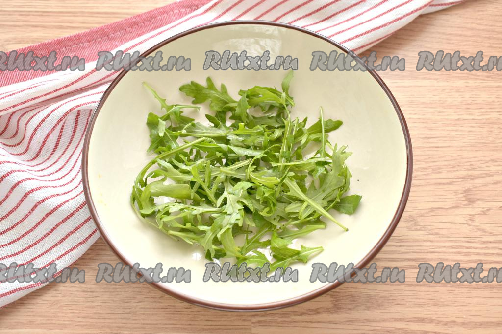 Рукколу ополаскиваем водой, обсушиваем, а затем перекладываем в салатник.