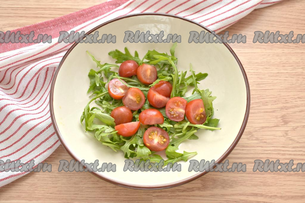 Промываем помидоры черри, разрезаем их на 2 половинки и добавляем к рукколе.