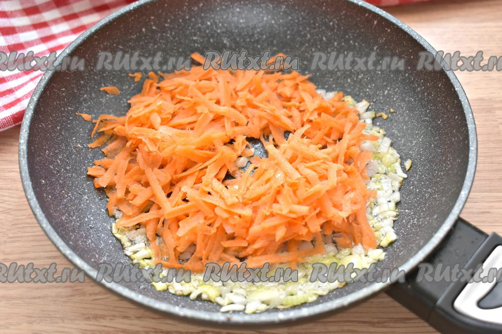 Натираем очищенную морковь на крупной тёрке и перекладываем к обжаренному луку, перемешиваем и обжариваем овощи, иногда перемешивая, 4-5 минут (до мягкости морковки).