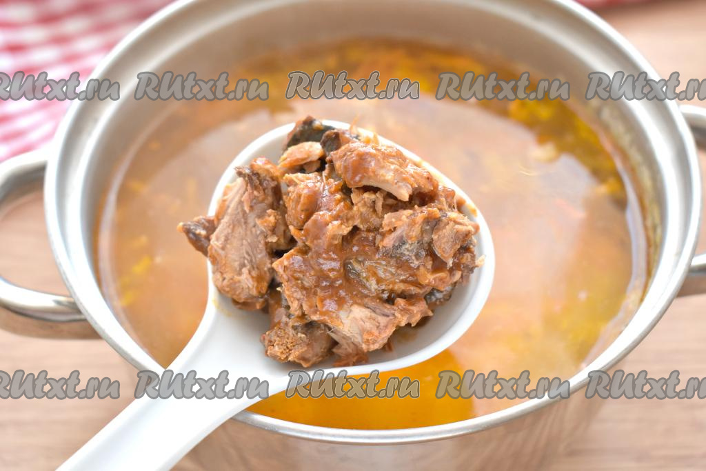 Открываем банку с консервами, достаём кусочки рыбы, немного разминаем вилкой, если они крупные, а затем перекладываем в щи, даём закипеть, а после этого варим на небольшом огне 5-7 минут.