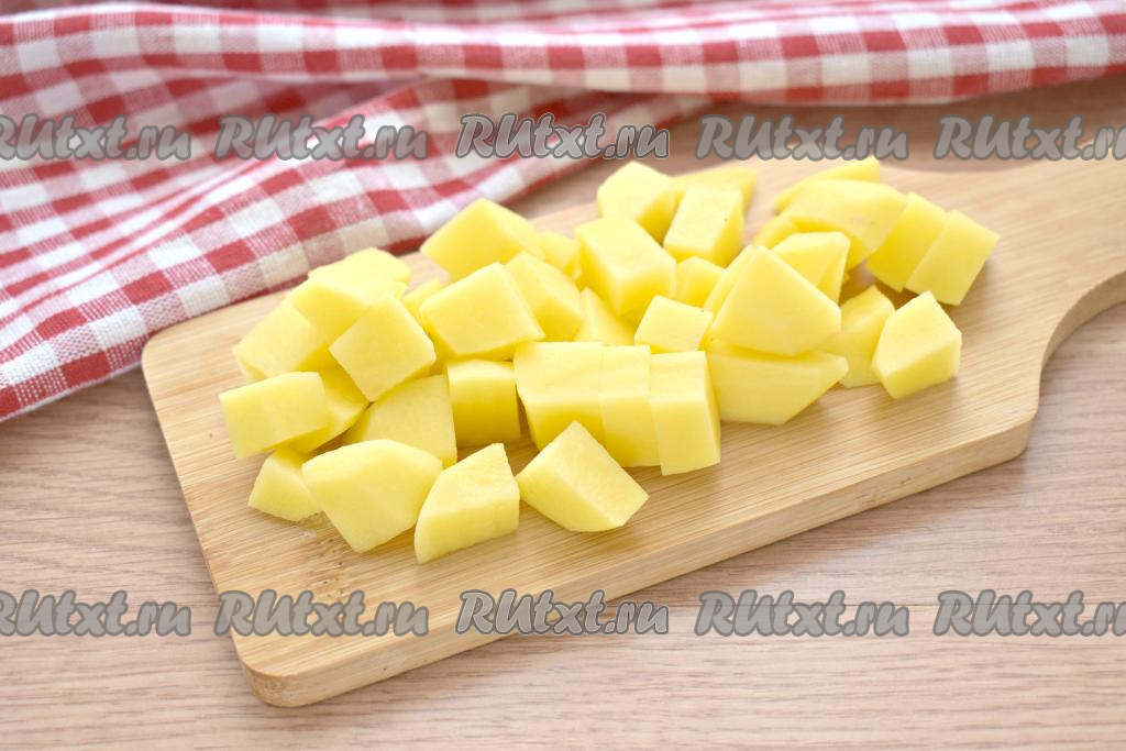 В кастрюлю наливаем 2 литра воды и доводим её до кипения. Нарезаем очищенную картошку на средние кубики и выкладываем в кастрюлю с закипевшей водой.