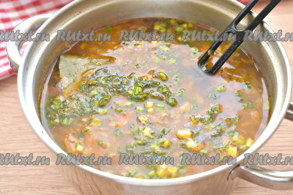 В конце приготовления рыбные щи с консервами и капустой по вкусу солим, перчим. Добавляем лавровый лист и мелко нарезанную зелень. Перемешиваем, провариваем минуту и выключаем огонь.