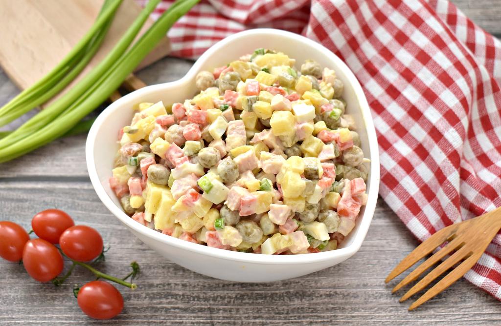 Вкусный, яркий, сытный салат "Столичный", приготовленный с копчёной курицей, подаём к столу в общем салатнике или в порционных креманках.