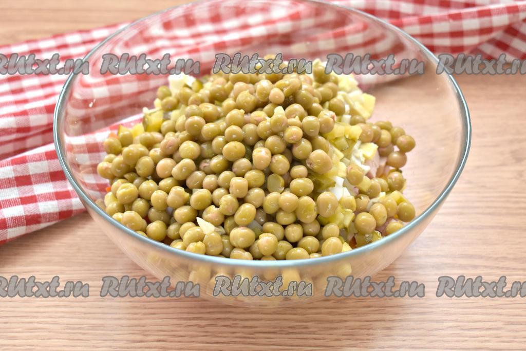 Зелёный консервированный горошек сначала откидываем на сито (или на дуршлаг), чтобы слить жидкость, а затем перекладываем в салатник.