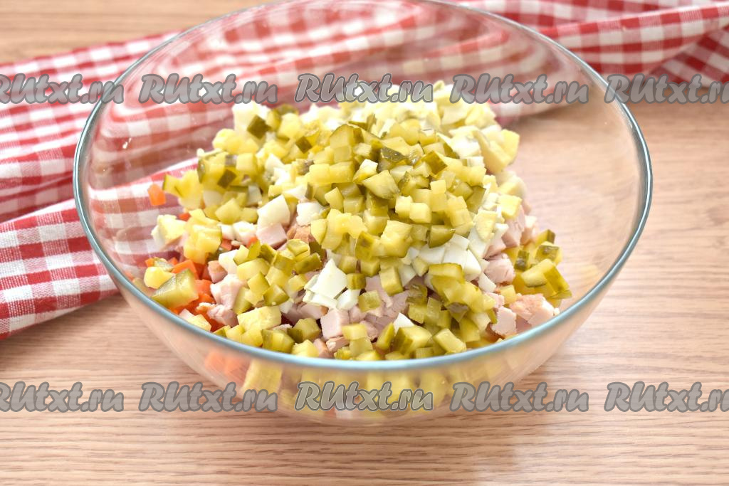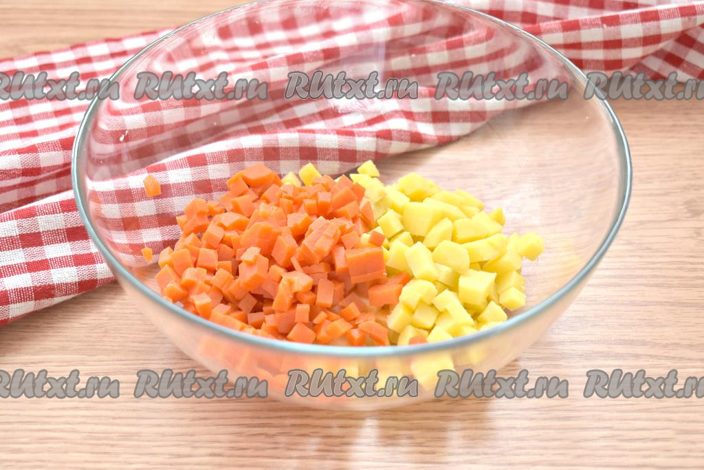 Заранее для салата отвариваем в кожуре картошку и морковь (варим с момента закипания воды минут 20-25). Яйца отвариваем после начала кипения воды в течение минут 10. Варёные картошку, морковь и яйца остужаем под холодной водой, а непосредственно перед приготовлением салата очищаем. Картошку и морковку нарезаем на небольшие кубики, перекладываем в салатник. Ингредиенты в этом салате нужно нарезать на кубики так, чтобы размер кубиков был примерно равен размеру консервированного горошка.