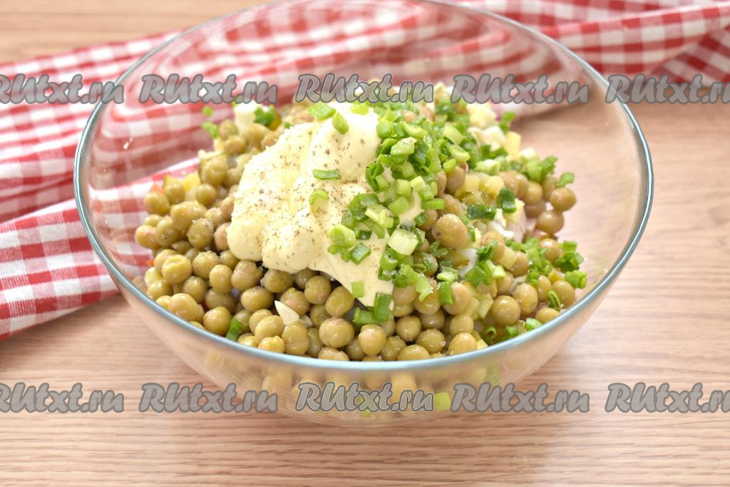 Зелёный лук моем, обсушиваем, нарезаем и вместе с майонезом добавляем в салатник, перчим салат и солим.