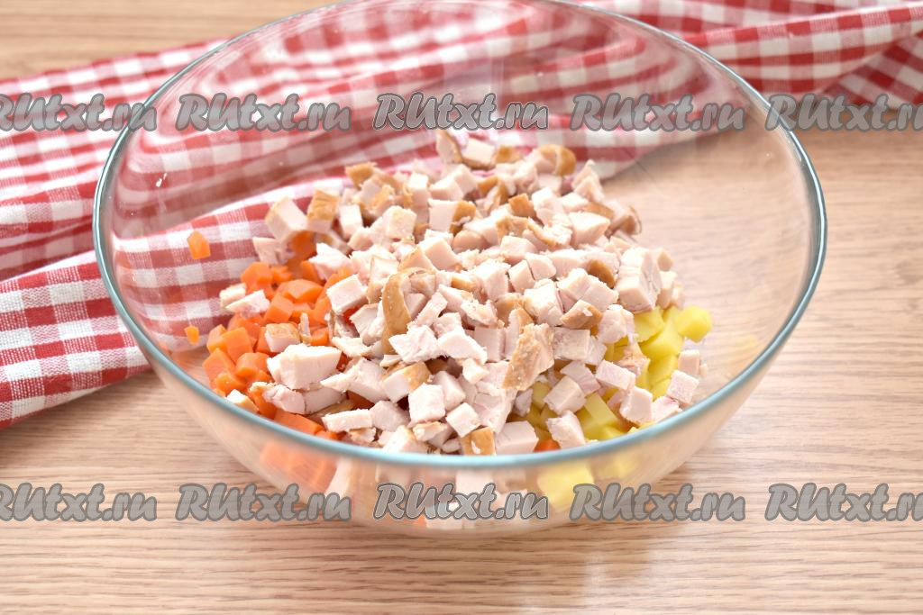 Добавляем в салатник мясо копчёной курицы, тоже нарезанное на небольшие кубики.