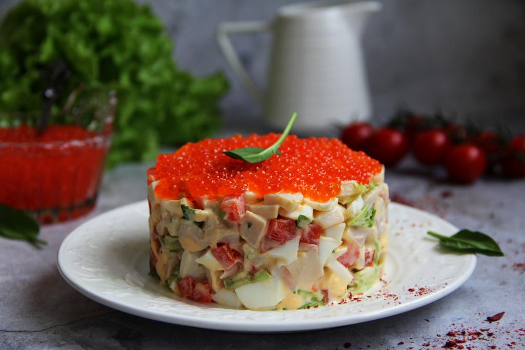 Хочу предложить рецепт салата, который готовится из кальмаров, болгарского перца и яиц. Блюдо получается нежным, вкусным. Болгарский перец советую брать красного цвета, он сделает этот салат ещё и очень аппетитным. Главное в этом блюде - правильно сварить кальмаров, чтобы они получились нежнейшими. Этот салат можно подать и в будни, и в праздники. Я подавала его к новогоднему столу, поэтому украсила сверху красной икрой, но это необязательно. Этот салат в любом случае получается вкусным, а украшать его или нет - решайте сами.