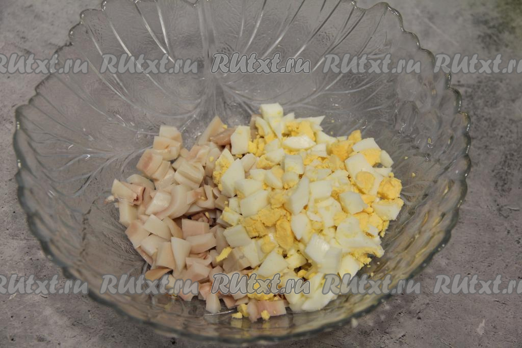 Яйца нарезать на средние кубики и переложить в салатник с кальмарами.
