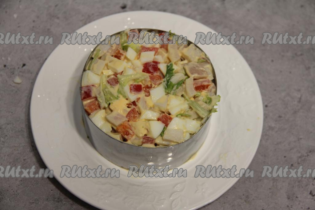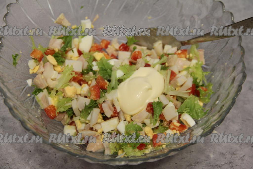 Посолить салат по вкусу и перемешать. Заправить майонезом перед подачей.