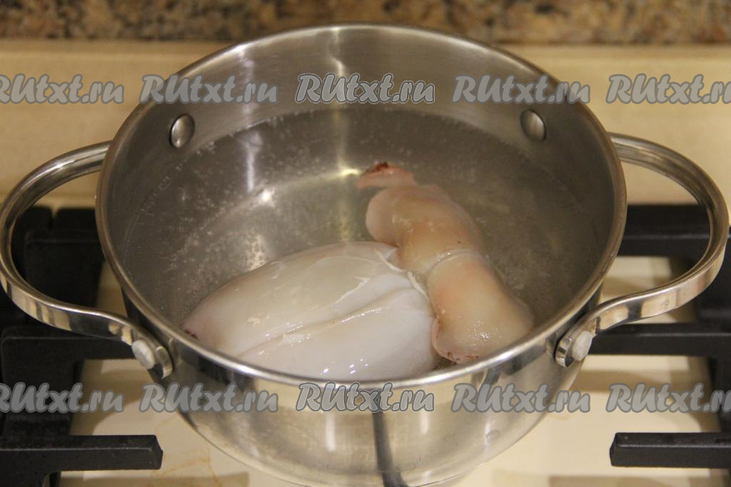 В кастрюлю влить воду, довести на сильном огне до кипения, немного уменьшить огонь. Опустить тушку кальмара в кипящую воду и варить 10 секунд на среднем огне с момента закипания. Затем достать кальмара, переложить на тарелку. Снова довести в кастрюле воду до кипения, выложить вторую тушку кальмара и тоже варить с момента закипания 10 секунд на среднем огне, после этого сразу достать из кастрюли и переложить на тарелку.