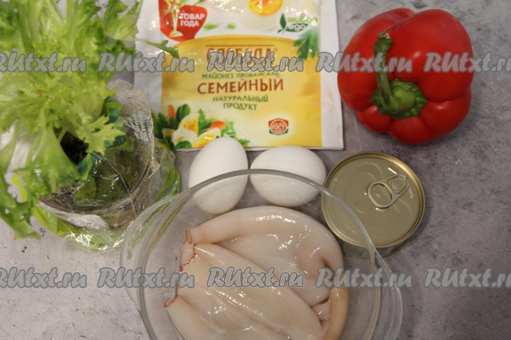 Подготовить продукты. Листья салата вымыть, обсушить. Сварить вкрутую яйца (с момента закипания воды варить минут 10), затем остудить их и очистить. Тушки кальмара разморозить при комнатной температуре, затем очистить от плёнки, покрывающей их поверхность, и убрать хорду, расположенную внутри тушек. Болгарский перец лучше всего взять мясистый. Я предпочитаю для этого блюда брать перец красного цвета, тогда салат получается очень аппетитным.