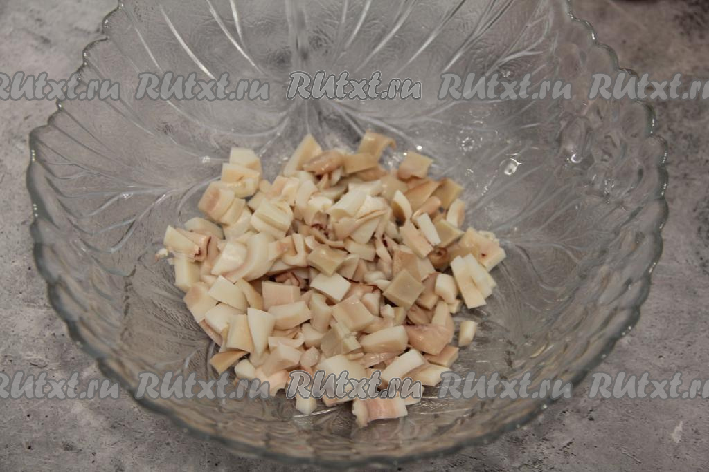 Дать кальмарам остыть. Остывших кальмаров нарезать на квадратики среднего размера и выложить в салатник.