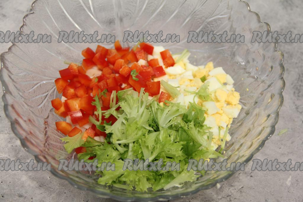 Болгарский перец очистить от семян и плодоножки, промыть водой, немного обсушить, затем нарезать на небольшие кубики, добавить в салат из кальмаров и яиц. Листья салата порвать руками на части и тоже выложить в салатник.