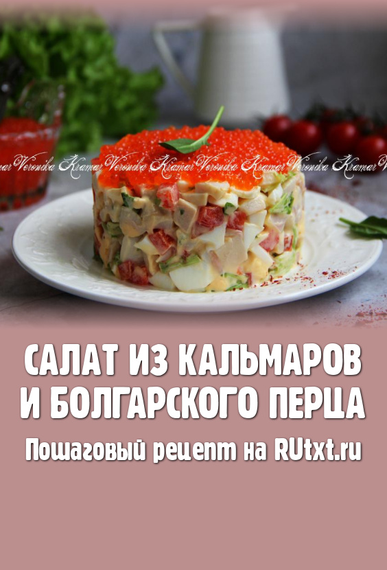 Я подавала этот салат на новогодний стол, поэтому украсила его сверху красной икрой, но это, безусловно, по желанию. Будете вы украшать это блюдо или нет - решать вам, главное, что салат из кальмаров и болгарского перца получается ярким, нежным и очень вкусным.