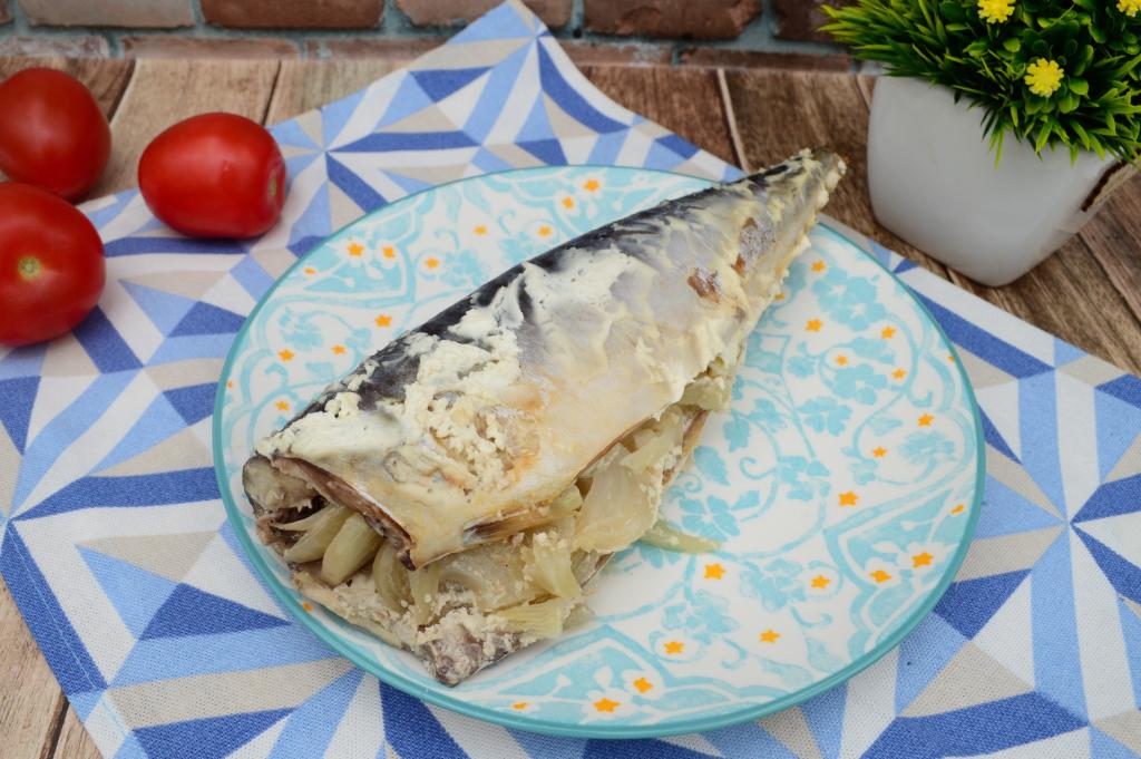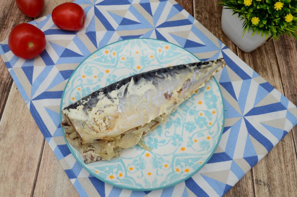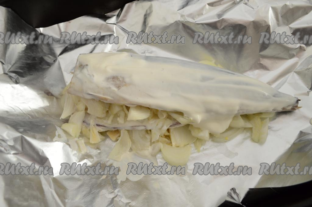Подготовленную скумбрию посолить, смазать внутри и снаружи со всех сторон сметаной, а затем выложить рыбу поверх лука, лежащего на фольге. В брюшко скумбрии вложить оставшийся нарезанный лук.