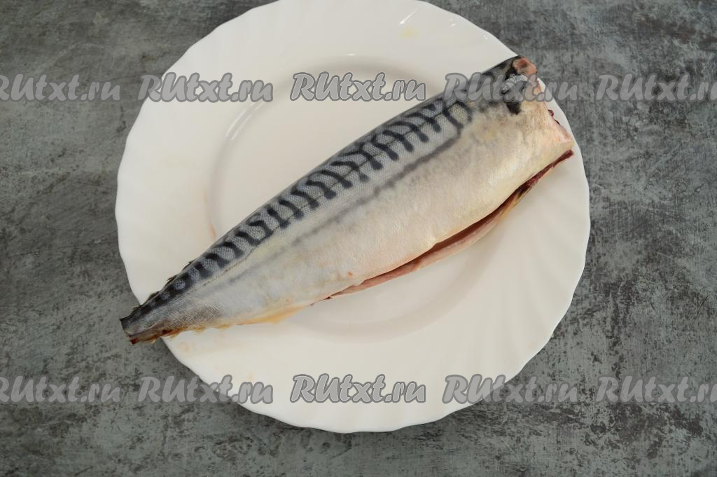 Голову, хвост и плавники скумбрии отрезать. Из брюшка удалить все внутренности, не забывая убрать и чёрную плёночку. Тщательно промыть рыбку, дать ей немного обсохнуть.