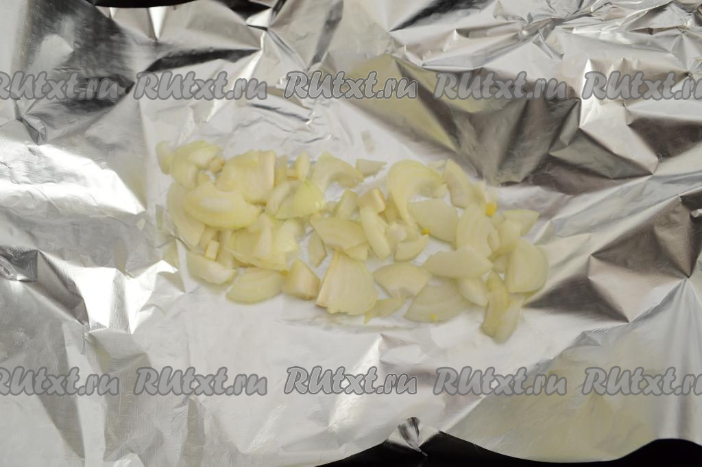 В форму для запекания выложить фольгу, на неё разложить 1/3 часть нарезанного лука.