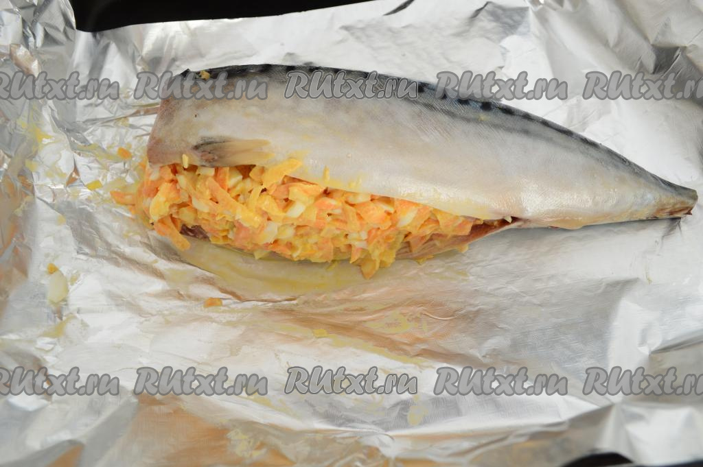 В подходящую форму для запекания выложить фольгу. Подготовленную скумбрию переложить на фольгу, наполнить брюшко рыбы смесью из овощей и яйца, слегка утрамбовывая начинку.
