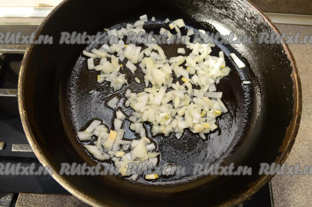 Прежде всего займёмся начинкой для фарширования скумбрии, для этого нужно мелко нарезанный лук выложить на сковороду, разогретую с растительным маслом, и обжарить его на среднем огне минуты 3-4 (до прозрачности лука), иногда помешивая.