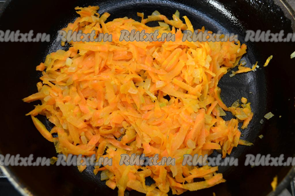 К обжаренному луку выложить натёртую на крупной тёрке морковку, перемешать. Обжаривать овощи 5-7 минут (до готовности моркови), периодически перемешивая.