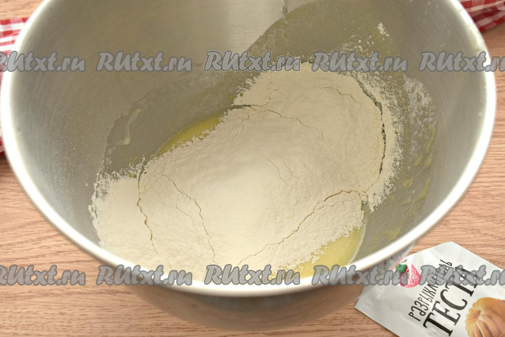 В получившуюся смесь всыпаем разрыхлитель, частями добавляем муку, перемешивая тесто миксером.