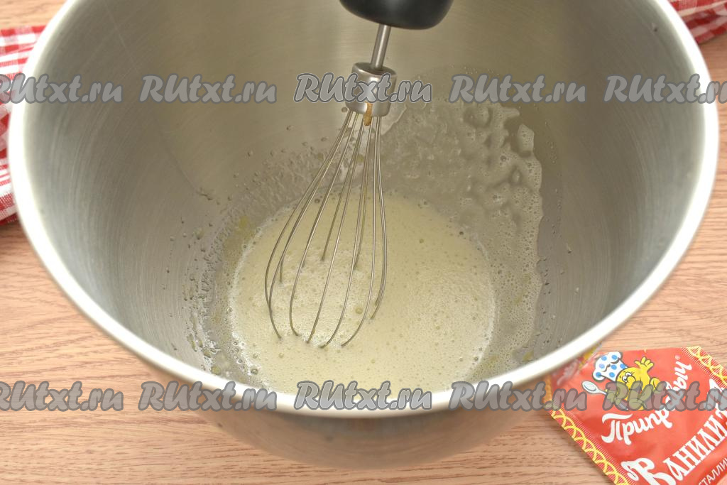 Сливочное масло растопить (например, в микроволновке) и дать ему остыть до комнатной температуры. Молоко подогреть, оно должно стать комнатной температуры. В миску разбиваем куриные яйца, всыпаем сахар и ванилин, взбиваем миксером в течение 2-3 минут.