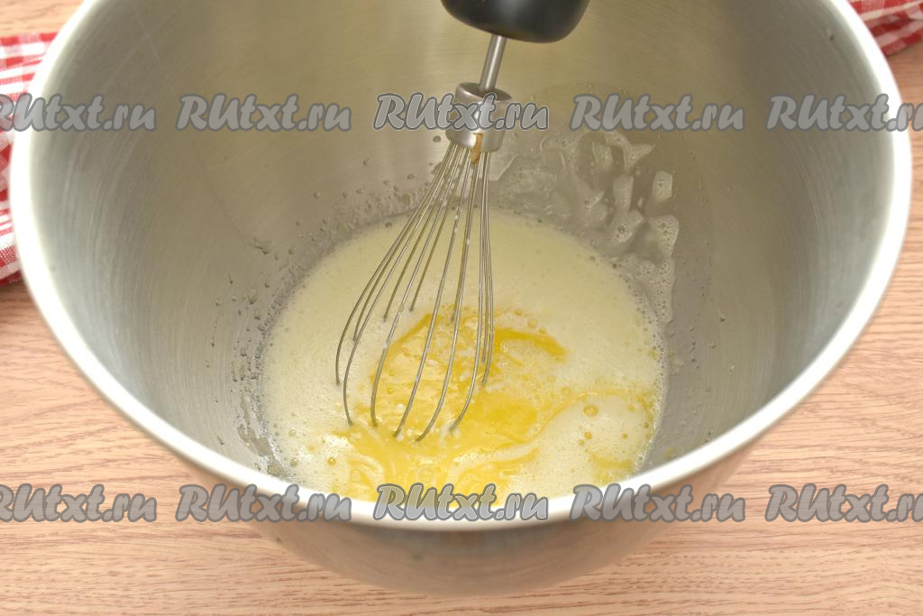 В получившуюся яичную смесь вливаем молоко комнатной температуры и растопленное сливочное масло комнатной температуры, взбиваем миксером в течение 1 минуты.