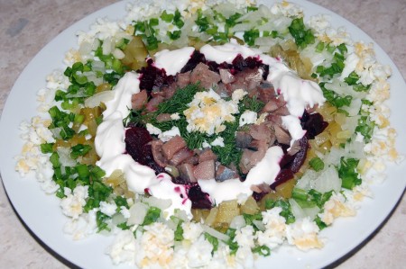 Взять плоское блюдо или тарелку и кругами разложить приготовленные овощи, свеклу и сельдочку, заправить салат сметаной.