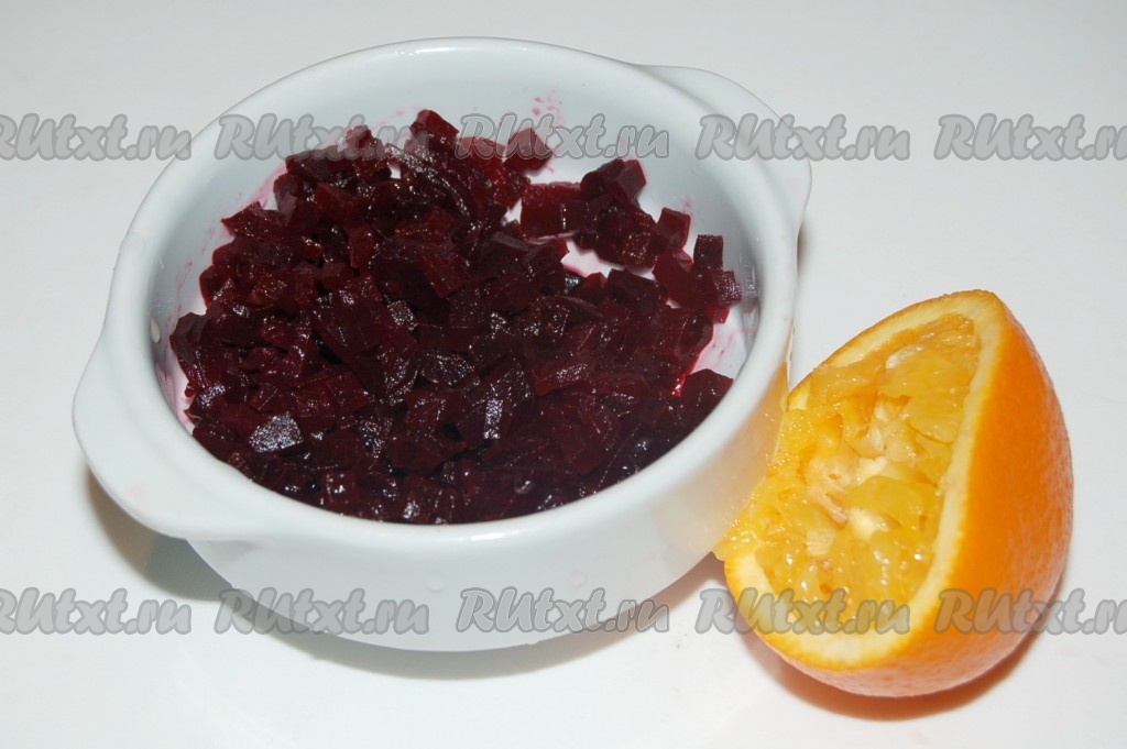 Свеклу отварить, остудить, нарезать кубиками, выжать в нее сок из апельсина, перемешать и убрать в холодильник на 1 час, чтобы свекла промариновалась в апельсиновом соке.