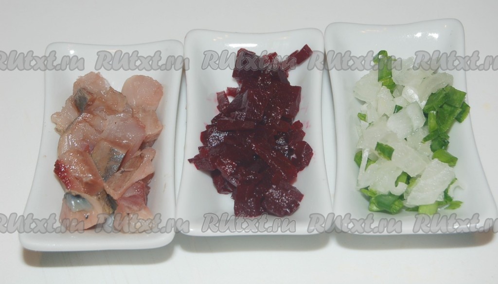 Приготовить для салата нарезанные кубиками сельдь, репчатый лук в смеси с зеленым и маринованную свеклу.